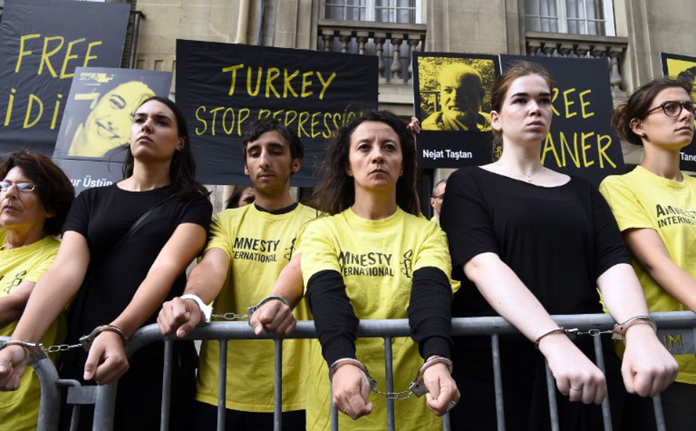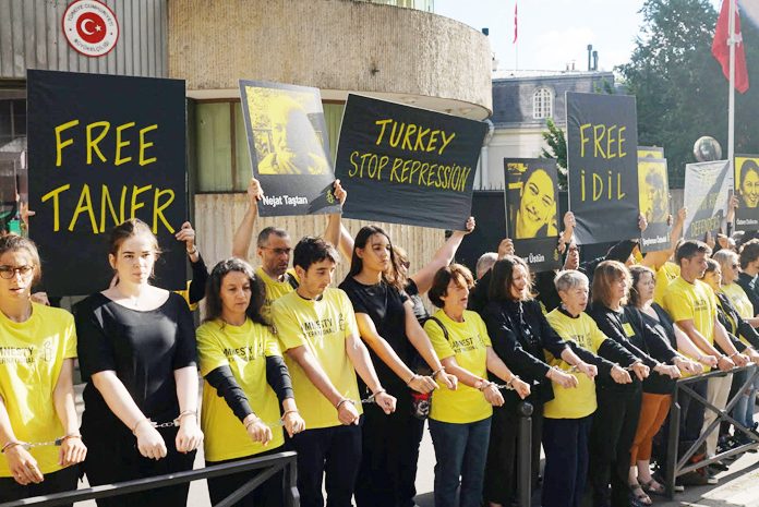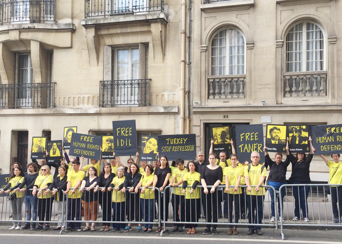 Türkiye’nin Paris Büyükelçiliği önünde, Uluslararası Af Örgütü üyesi 50 kişiye yakın activist, geçen Haziran ayı başından bu tarafı tutuklu bulunan, Uluslararası Af Örgütü Türkiye Şubesi’nin yönetim kurulu başkanı Taner Kılıç ile yöneticilerden İdil Eser’in şartsız olarak acilen serbest bırakılması için eylem yaptı. Sabah erken bir saatte büyük elçilik önünde üzerlerine sarı tişört giymiş ve kendi ellerini kelepçelemiş, çoğunluğu kadın aktivistelren oluşan 50 kişiye yakın,Uluslararası Af Örgütü aktivistleri, tutuklu bulunan Taner Kılıç, Serbest Bırakmalı ve Hakkındaki Suçlamaları kaldırılması isteğinde bulundular.