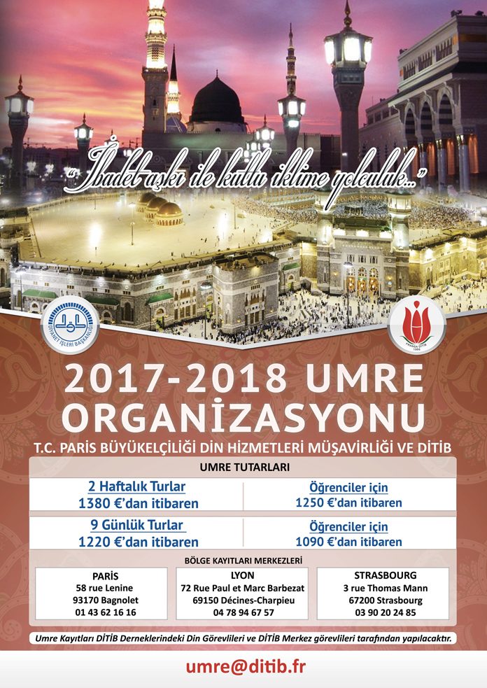 Paris Din Hizmetleri Müşavirliği ve DİTİB ortaklığı ile 9 ve 15 gün olmak üzere iki ayrı paket halinde 2017- 21018 yılları içerisinde toplam 14 ayrı Umre Turu düzenlenecektir. Umreye gitmeyi düşünen vatandaşlarımız DİTİB’e üye olan Derneklerin Camii’lerinde görev yapan Din Görevlileri vasıtasıyla veya bizzat Fransa DİTİB Genel Merkezi’nde Umre kayıtlarını yaptırabilecekler. Gençler ve çocuklar için özel fiyat uygulanmaktadır. Geniş ve daha detaylı bilgi almak için yukarıda sözü edilen kurum ve kişilerle irtibata geçmeniz yeterlidir. Umre ile ilgili Her türlü bilgiyi bu telefon numarasından öğrenebilirsiniz. Tel:0143621616.
