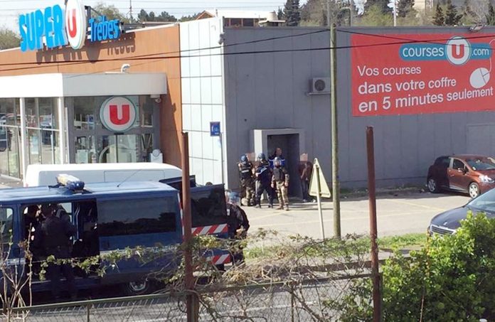 Fransa’da Rehine Krizi, 2 Ölü 16 yaralı olduğu açıklandı. Saldırgan, DEAŞ’lı Teröris Salah Abdulselam’ın Bırakılmasını İstiyor. Fransa’nın Carcasson kentinin Trebes kasabasında sabah sporu yapan 3 jandarma’dan 2’sini silahla yaralayan saldırgan daha sonra aynı kasabadaki U adlı süpermarkette çalışanları ve içerdeki müşterileri rehin alıp iki kişiyi öldürüp 16 kişiyi de yaralayan saldırgan, olay yerinde vurucu tim tarafından infaz edildi.