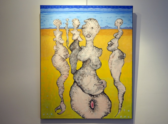 Galerinin Sağ duvarında gördüğünüz bu tablo, lohusa kadınların durumu, hepsi hamile olan kadınlar, dünyaya bir canlı getirebilme düşünce ve uğraşılarını konu alan çalışmalarını sergilediğini « söyledi. Sanatçı Erke, bu tür yaşananlardan etkilendiğini söylediği tablolarında kendine özgü tarzıyla ele aldığı değişik insan figürlerini “Düzeltilmemiş geçmiş zaman insanları” olarak adlandırıyor.