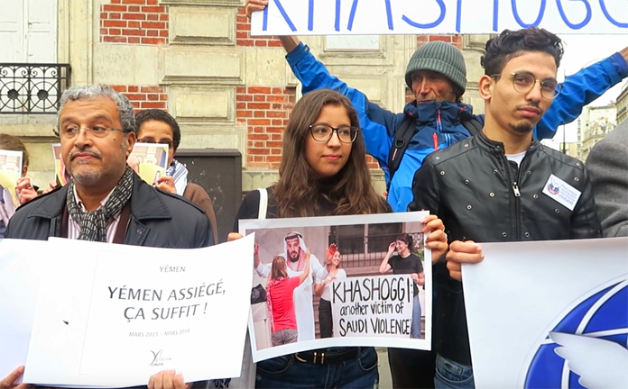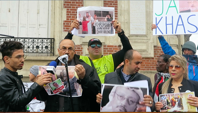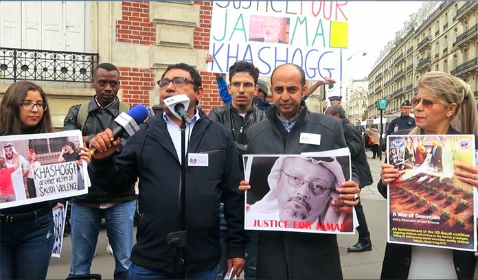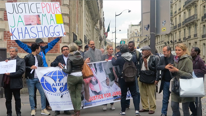 Fransa’nın başkenti Paris’teki Suudi Arabistan Büyükelçiliği önünde, öldürülen Suudi gazeteci Cemal Kaşıkçı için protesto gösterisi düzenlendi. Protestoda Kaşıkçı’nın katillerinin bulunup gereken cezayı almaları için çağrı yapıldı. Fransa’nın başkenti Paris’te Suudi Arabistan Büyükelçiliği önünde toplanan, Uluslararası Hak ve Özgürlükler İttifakı Birliği, İstanbul’daki Suudi Arabistan Konsolosluğu’nda öldürülen gazeteci Cemal Kaşıkçı için protesto gösterisi düzenledi. Birlik temsilcileri Kaşıkçı’nın kayıp naaşının bulunması ve sorumluların cezalandırılması için çağrıda bulundu.