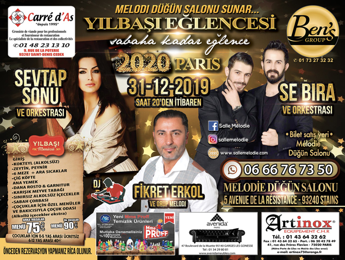 Paris’teki Türk mğlence mekanları yeni yıl 2020 için kutlama proğramlarını oluşturmaya başladılar. Melodi düğün salonu her yıl başı olduğu gibi bu yılbaşı da dolu dolu çok zengin bir program hazırladı. Mekan sahibi Fikret Erkol, yeni yıla dışarıda eğlenerek girmek isteyenler için aile bütçesini zorlamıyacak uygun menu alkol ve alkolsüz iki farklı tarife sunuyor ve sabaha kadar eğlence vaadediyor.