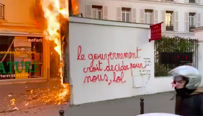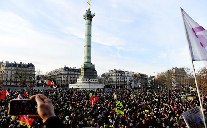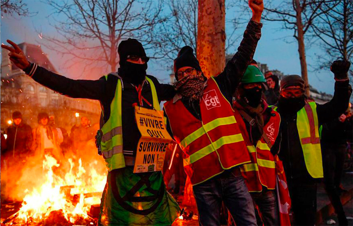 Fransa’da sarı yeleklilerin her Cumartesi düzenli olarak yaptıkları hükümetin ekonomik proğramı protestolarına Cumhurbaşkanı Macron yönetiminin emeklilik reformuna karşı çıkanlar sendikalar olmak üzere bir çok kamu çalışanı, ülke genelinde gösteriler düzenledi. Sendikaların çağrısıyla başkent Paris’in Nation Meydanı’nda toplanan hükümetin emeklilik reformu karşıtları, Republique Meydanı’na kadar yürüdü. Sarı yelekliler ile Rack Block adlı grubun da yer aldığı gösteride yer yer polis ile göstericiler arasında arbede çıktı, göstericiler çöp bidonlarını yakıp çevredeki bankaların vitrinlerini kırıp tahrip ettiler.Göstericiler Macron karşıtı sloaganlar atıp pankartlar taşıdılar. polis ile göstericiler arasında yaşanan arbede dolayısıyla. Polis biber gazıyla müdahale etti. göstericiler, bir reklam panosu ve birçok çöp bidonunu yakarak dikkat çekmek istediler. Çok sayıda iş yerinin camını kırdı ve çevreye zarar verdiler. İçişleri Bakanlığı eyleme karışan 21 kişinin gözaltına alındığı açıkladı. İçişleri Bakanlığı ülke genelinde düzenlenen gösterilere 20 bini aşkın kişinin Paris’teki gösterilere katıldığını açıklarken ülke genelinde gösterilere 150 bine yakın kişinin katıldığı belirtildi. Sendikalara göre ise 150 bini Paris’te olmak üzere ülke genelindeki gösterilerde 500 bin kişi yer aldığı idiasında bulunuyor.Sonu gelmeyen grev ve gösterilerden bıkan Fransız halkı yapılan bir araştırmaya göre, Fransızların yüzde 75’i reformun geri çekilmesini veya değiştirilmesini istiyor. Hükümet anket sonuçlarına göre değişikliğe gitti ve 64 yaş isteğini geri çektiğini açıkladı. Macron yönetiminin emeklilik reformuna karşı başlatılan grevler 38 gündür devam ederken sağlık ve ulaşım hizmetlerinde yaşanan ciddi şekildeki aksamalar günlük hayatı felç ediyor.