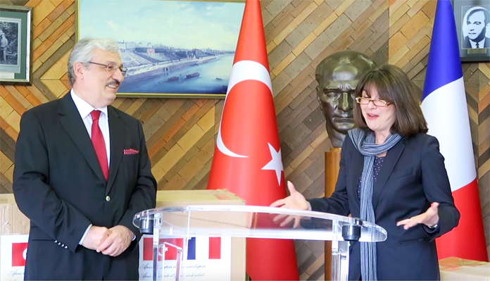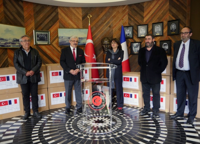 Türkiye, Fransız senatörün Covid-19 yardım talebini geri çevirmedi. Türkiye’den tıbbi yardım talebinde bulunan Fransız Senatör Nathalie Goulet, gönderilen sağlık malzemelerini Türkiye’nin Paris Büyükelçiliği’nden teslim aldı.