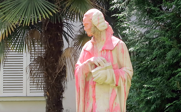 Kimliği belirsiz kişiler tarafından Voltaire’in heykeli kırmızıya boyandı. Heykelin kırmızıya boyanması, birçok ülkedeki ırkçılık karşıtı göstericilerin Floyd’un ölümü sonrası başlayan küresel protestolar kapsamında köle ticaretinde veya sömürgecilikte rol oynayan önemli tarihi figürleri onurlandıran anıtların yıkılması için başlattıkları bir hareket olarak yorumlandı. Servetinin bir kısmını sömürge ticaretine borçlu olduğu iddia edilen ve Fransız aydınlanma döneminin ana düşünürlerinden olan Voltaire’in heykeline saldırı birçok kişinin ise tepkisini çekti.