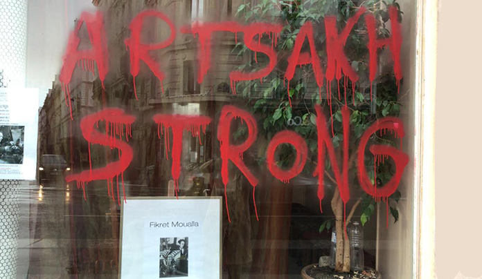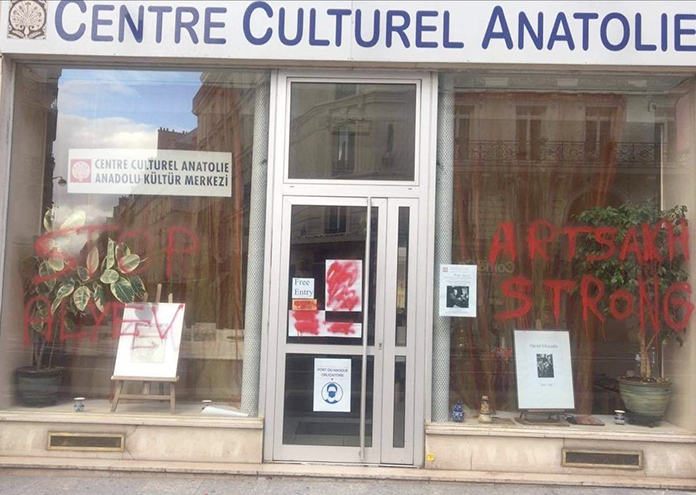 Paris Anadolu Kultür Merkezi’ne Cumartesiyi Pazar’a bağlayan gece kimliği belirsiz kişiler tarafından, Kültür Merkezi’nin vitrinine “ Stop Aliev “ ve Ermenice “ Artsakh Strong ( güçlü Artsakh) sözleri kırmızı boya ile yazılarak, Azerbaycan ile Ermenistan arasında süren Karabağ savaşına dikkat çekilmek istenilmiş.Dr. Fıtrat Demir Onger’in başkanlığını yürüttüğü Paris Anadolu Kültür Merkezi’de daha evvel de geçen yıllarda, kırmızı boya ile benzer yazılar yazılmıştı.Kültür ve sanat etkinlikleri dışında bir amacı olmayan Paris Anadolu Kültür Merkezi’ne yapılan boyalı saldırının Fransız-Türk dostluğunu sabote etmeyi tanıtma amaçladığını belirten Merkez’in Başkanı Dr. Onger,Kültür Merkezi’ne boyalı saldırıyla ilgili olarak, olaydan Fransız polisini haberdar edeceklerini ve boyalı saldırıyı yapanların bulunması ve Kültür Merkezi’nin güvenliği için gereken önlemin alınması talebinde bulunacaklarını belirtti.