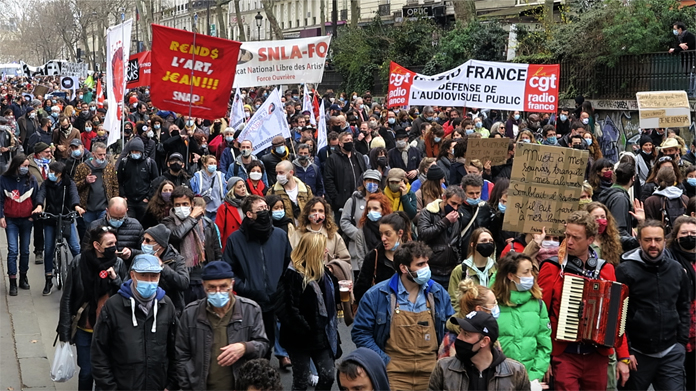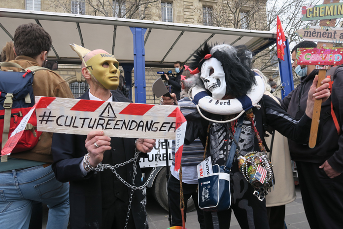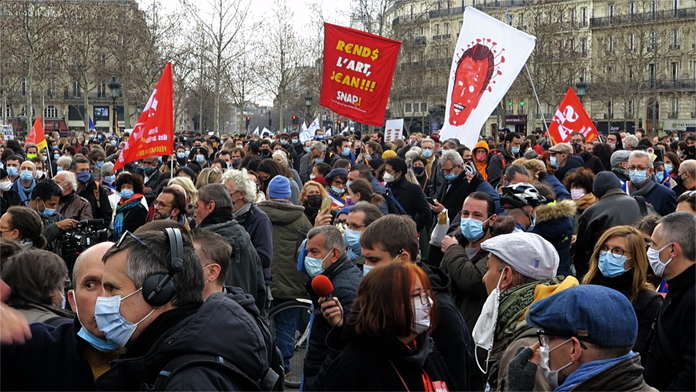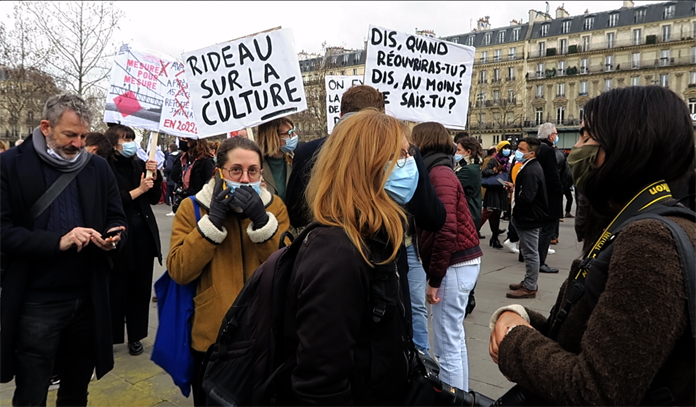 Fransa’da kültür sektörü çalışanları yeniden sokakta. Fransa’da Covid-19 salgını nedeniyle bir yıldır kapalı olan tiyatro, opera ve benzeri kültür sektörü çalışanları için hükümetin uyguladığı kısıtlamaları protesto etmek için yeniden sokağa indiler. Fransa’da Covid-19 salgını ile mücadele kapsamında uygulanan kısıtlamalar devam ederken, tiyatro, opera ve benzeri kültür sektörü çalışanları yeniden sokağa indi.