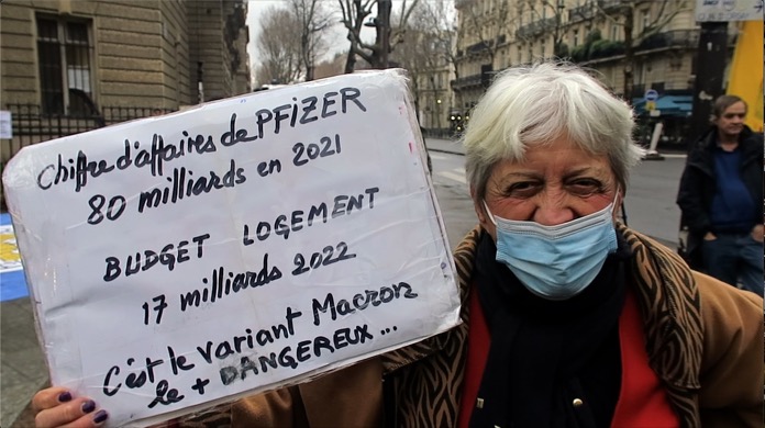 Fransa’da yaşanan lojman sorununun gittikçe daha büyük bir problem haline gelmeye başladığını belirten bir gösterici ise, elinde taşıdığı pankarta, “Alman aşı firması Pfizer’in bütçesi 80 milyar euro, Fransa’nın lojman bütçesi 17 milyar euro. Bu Macron mutasyonu çok tehlikeli” ifadelerini yazdı.