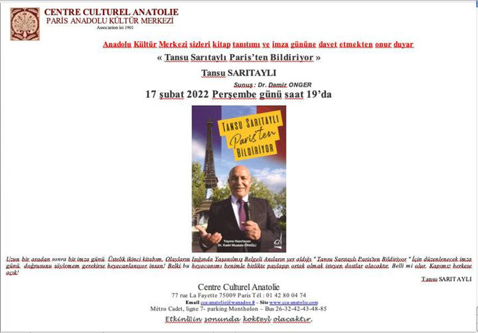 Yılda Yayımlanan, Paris’teki 40 yıllık mesleki anılamırın yer aldığı İkinci Kitabım ” Tansu Sarıtaylı Paris’ten Bildiriyor ” Okuyucuyla buluşuyor. Paris Anadolu Kültür Merkezi’nde 17 Şubat 2022 Perşembe günü saat 19:00 İtabiriyle, Anadolu Kültür Merkezi Başkanı Sayın Dr. Fıtrat Demir Onger’in açış konuşmasıyla kitabın tanıtımı yapılacak. Ayrıca kitap da yer alan belge niteliği taşıyan fotoğraflardan oluşan bir fotoğraf sergisi olacak. Dostlarımız ve okurlarımız davetlidir.