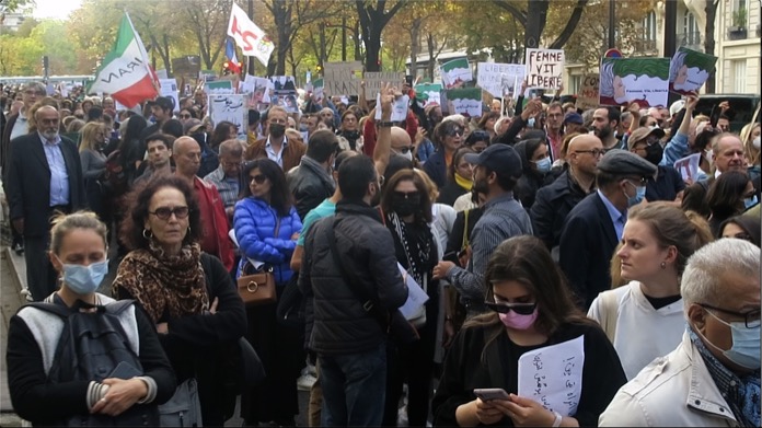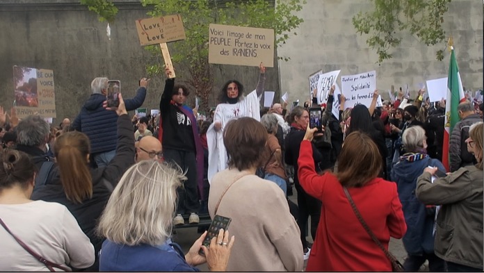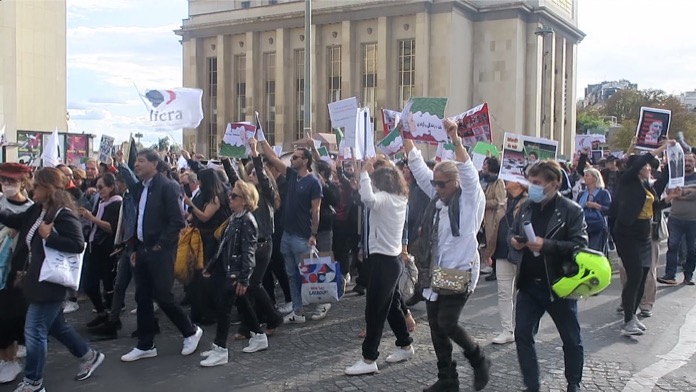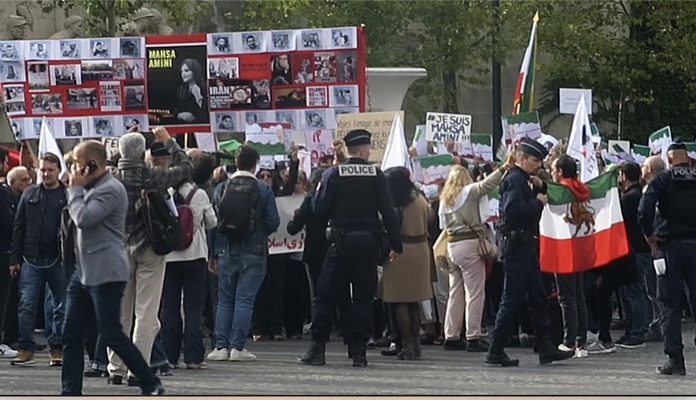 Öğleden önce Chatelet Meydanı’nda toplanan göstericiler öğleden sonra ise Eyfel Kulesi’nin karşısında bulunan Trocadero Meydanı’nda bir araya geldi. Trocadero Meydanı’nda toplanan yüzlerce gösterici, İran’ın Paris Büyükelçiliğine yürüdü. Polis, İran Büyükelçiliğine 200 metre kala göstericileri durdururken, polis ile göstericiler arasında arbede çıktı.