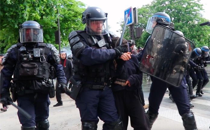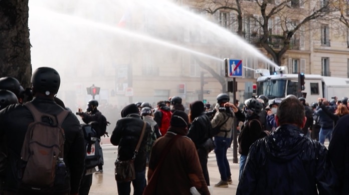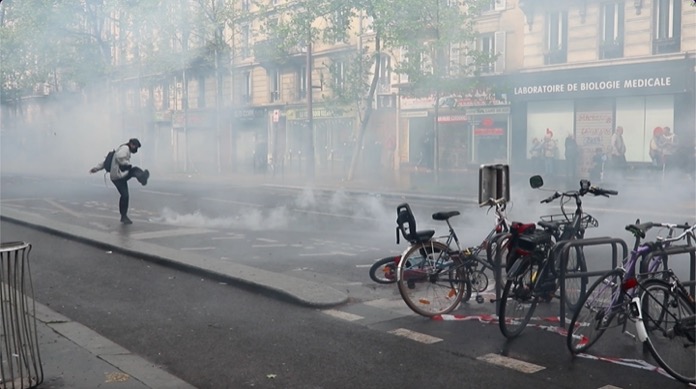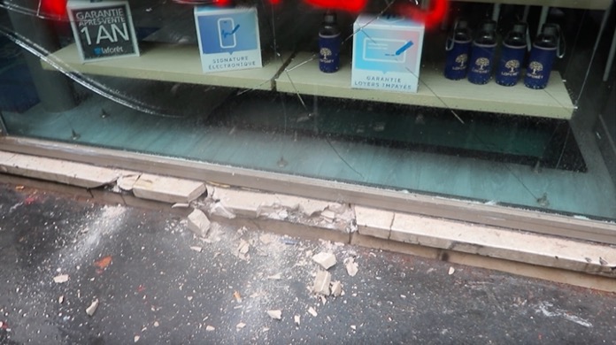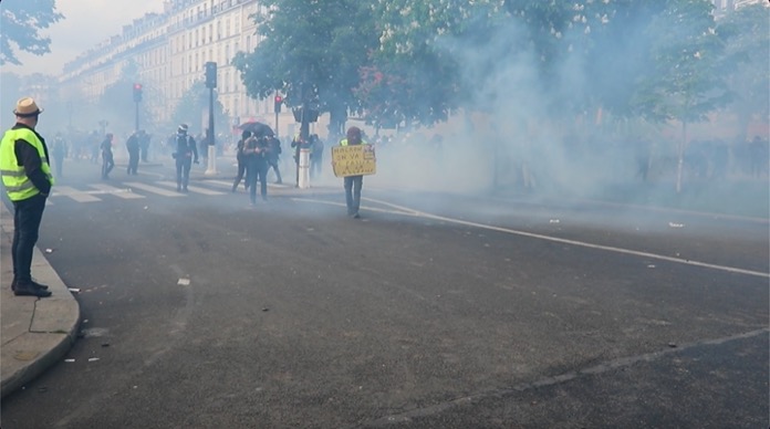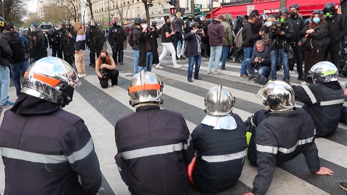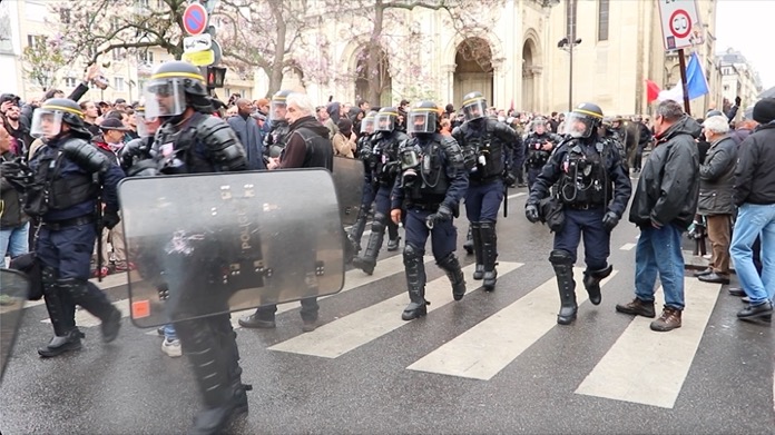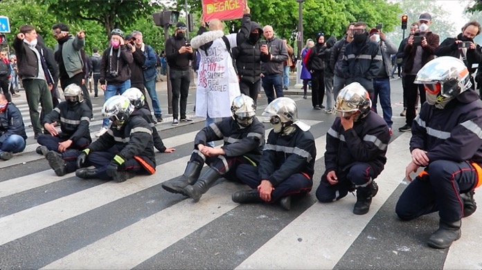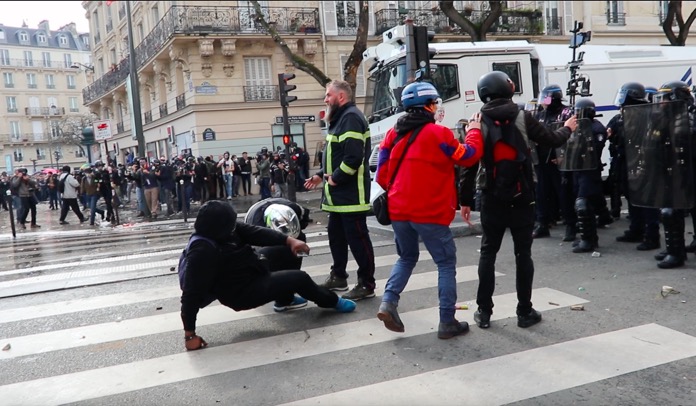 İş yerlerinin kapı girişinde bulunan mermerleri kıran göstericiler, kırık mermer ve beton parçalarını polis ve jandarmaların üzerlerine attılar. Polisler haliyle göz yaşartıcı gaz kullanarak kendilerine yönelik saldırıları püskürttüler. Gösterilere katılan Paris itfaiye erleri polis ve jandarmaların önünde oturma eyleminde bulundular.