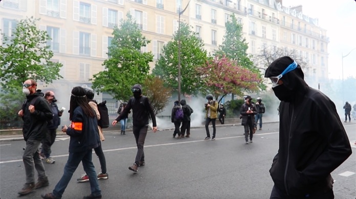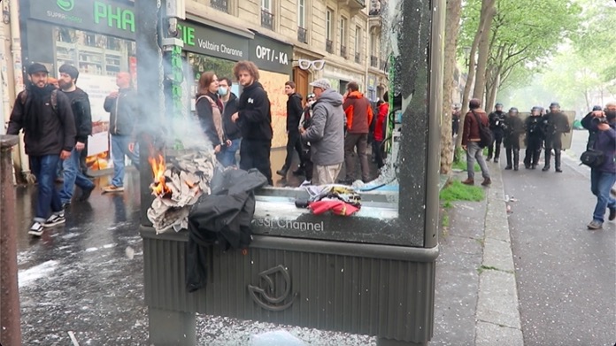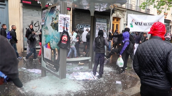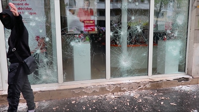 Emeklilik reformu karşıtı gösterilerde olduğu gibi yine siyah giyimli yüzleri kapalı gruplar, yürüyüş güzergahı üzerinde bulunan otobüs durakları yanlarında getirdikleri parçalarıyla kırdılar. Aynı şekilde bankaların vitrinlerin bankamatikleri tahrip eden göstericiler, çöp bidonları ile yol kenarındaki bisikletleri ateşe verip yaktılar.