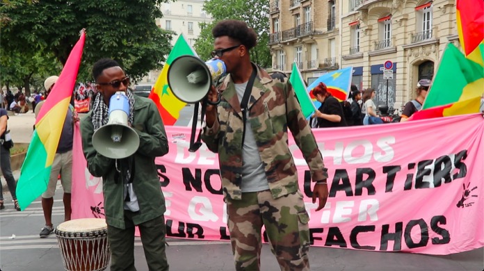 Göstericiler sık sık, Faşizmin geçmesine izin vermeyeceğiz. Her ne şekilde olursa olsun karşı çıkacağız. Faşizme karşı, ırkçılığa karşı, İslamofobiye karşı, sömürgeciliğe karşı, halkların uluslararası dayanışması için yürüyeceğiz. Fransa afrikayı sömürdüğün yetmedi mi ? Sömürmenize izin vermiyeceğiz, Fransa’nın denizaşırı kolonilerinden olan Nouvelle Kaladoniden Kanak örgütü de gösteriye katıldı.